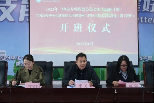 6月5日,2023年“中央专项彩票公益宏志助航计划”全国高校毕业生就业能力培训贵州工程应用技术学院基地(贵工贸班)在综合楼二楼报告厅举行开班仪式。校党委委员、副校长祁飞,贵州工程应用技术学院学工处处长丁虹,我校160余名毕业班师生参与开班仪式,开班仪式由就业办主任杨琴主持。