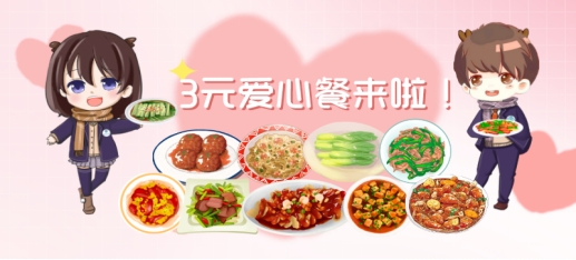 “爱心套餐”含“两个特价菜+米饭”,售价不超过3元/份,午餐、晚餐期间均有供应,仅限本校学生购买。