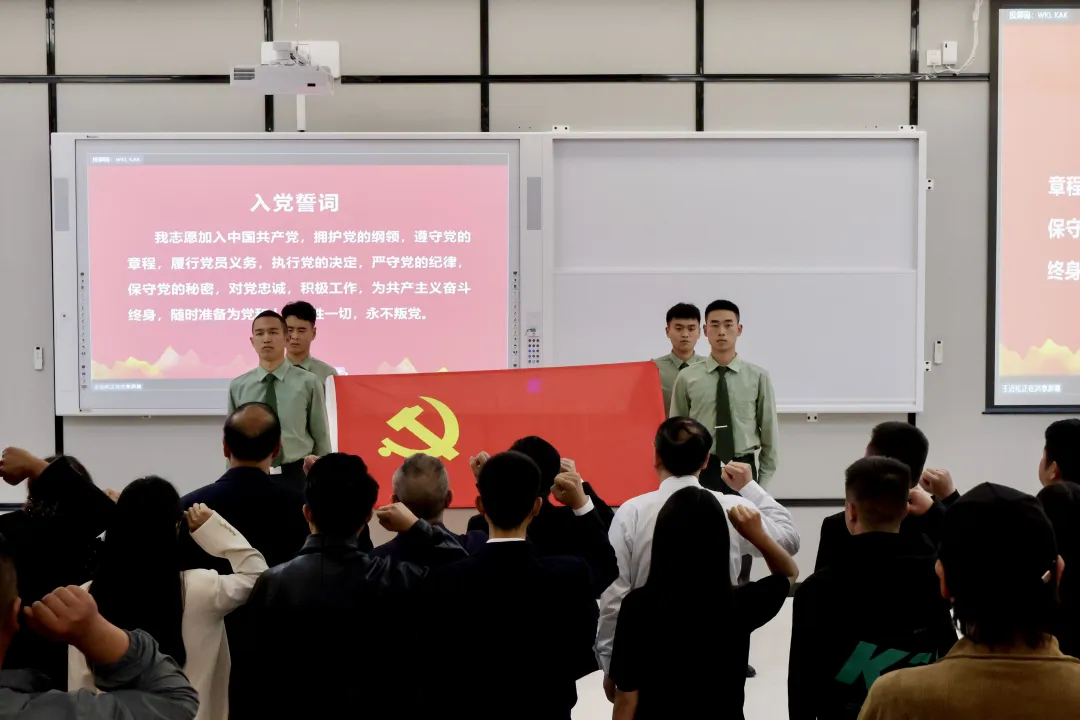 “我志愿加入中国共产党,拥护党的纲领,遵守党的章程,履行党员义务,执行党的决定,严守党的纪律,保守党的秘密,对党忠诚……”在校党委副书记、纪委书记聂立新的领誓下,全体党员面向党旗重温入党誓词。