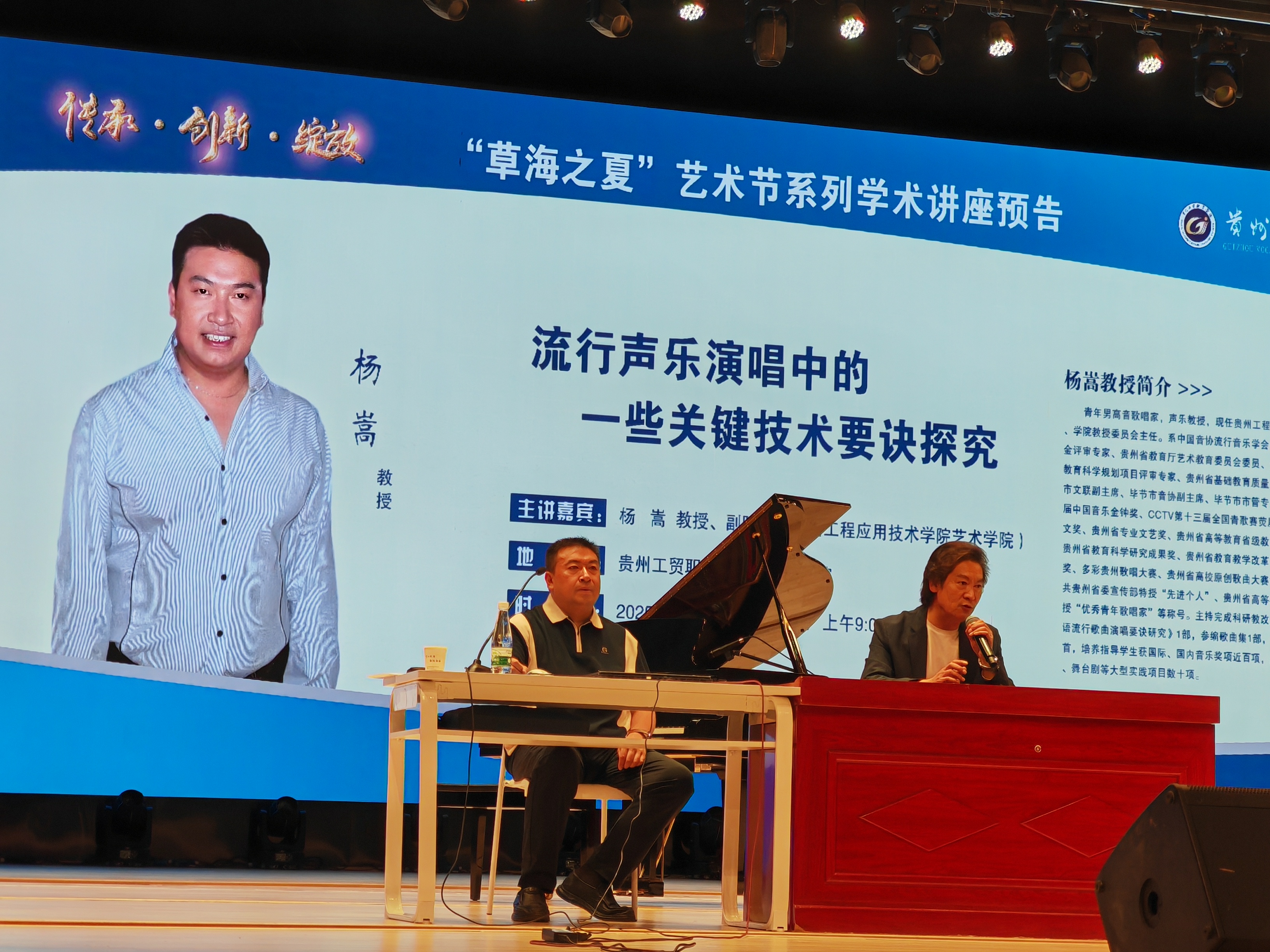 6月13日上午,贵州应用工程技术学院艺术学院副院长杨嵩教授受邀到beat365官方网站辰海大剧院,为艺术学院师生带来了一场题为《流行声乐演唱中的一些关键技术要诀探究》的专题学术讲座。全院师生齐聚一堂,共同参与了这场理论与实践并重的音乐盛会。讲座由艺术学院院长周正军主持,