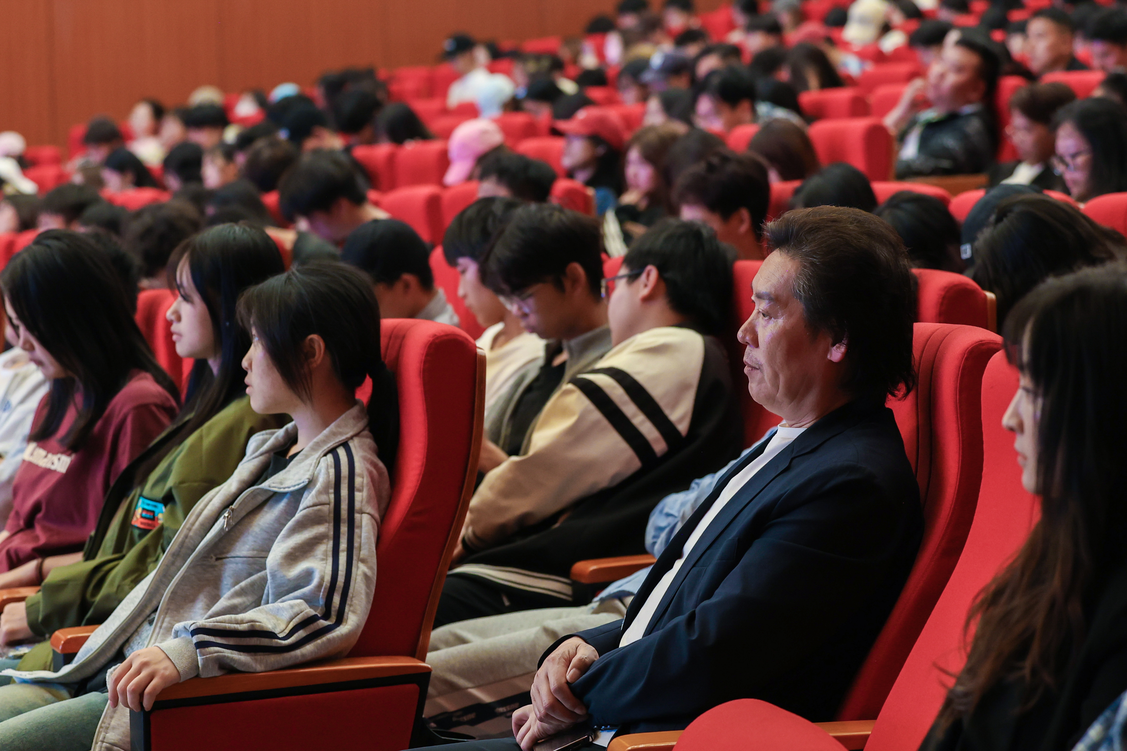 在讲解歌手嗓音类型与演唱风格形态时,杨嵩不仅详细解析了理论知识,更即兴示范了多种唱法转换技巧,其专业的演绎引得现场掌声不断。他还重点讲解了演唱前的意识基础、心态调试和基础准备工作,强调“演唱不仅是技术的展现,更是情感的表达”这一重要理念。讲座中,杨嵩特别强调了歌曲作品的选择与翻唱方法,并分享了流行声乐演唱的26项关键技术诀窍,内容详实且富有启发性。此外,他还介绍了流行练声速成法,并通过现场发声练习与歌唱教学环节,与师生展开深度互动。在实践教学环节,三位音乐表演专业的学生在杨教授的指导下进行了现场演唱示范,杨嵩从气息控制到情感表达都给予了细致点拨和专业指导,赢得了阵阵掌声。