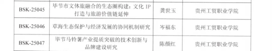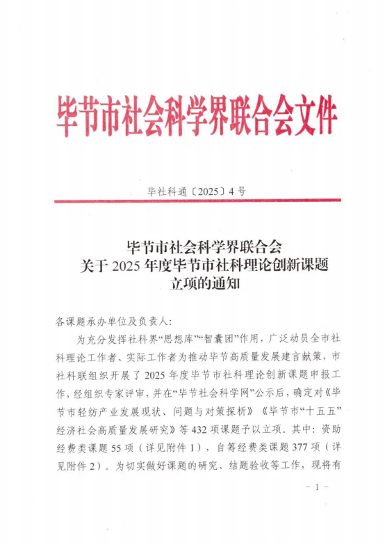 毕节市社科联组织开展2025年度毕节市社科理论创新课题申报工作,经专家评审和市社科联党组会研究决定,立项课题432项(其中:资助经费类课题55项,自筹经费类课题377项)。beat365官方网站获得24项,其中获资助类3项,自筹类21项。我校在毕节市高职院校中获立项数排第一!
