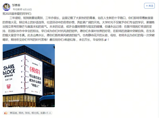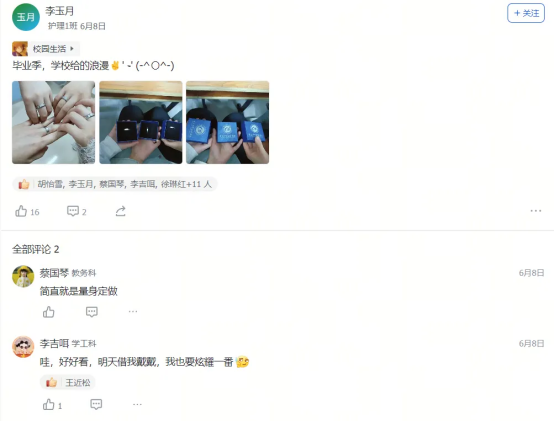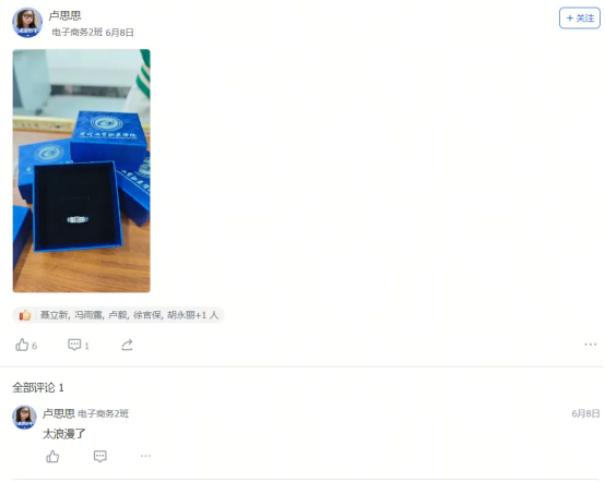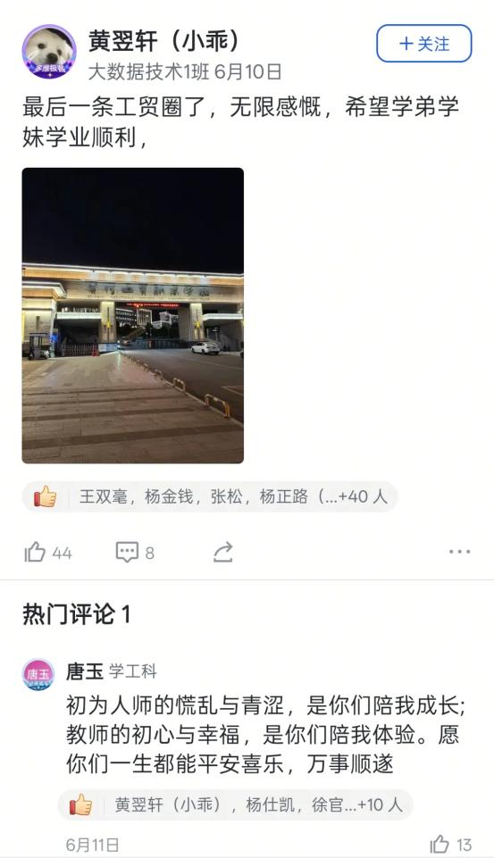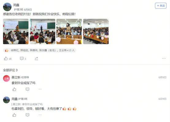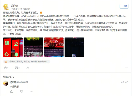 艺术设计1班的迟同学在毕业晚会后飞书工贸圈的深情致谢,大数据技术1班的黄同学发出的“最后一条工贸圈,无限感慨,祝学弟学妹们学业顺利!”及其评论区里唐玉老师“初为人师的慌乱与青涩,是你们陪我成长”的动情回应……这一条条动态,一声声祝福,一幅幅定格在飞书工贸圈里的鲜活画面与肺腑之言,早已超越了简单的社交分享。它们无声地串联起散落天涯的思念,凝聚成贵工贸这个大家庭最温暖、最坚韧的情感纽带。在这个注定要各自远航的夏天,工贸圈成为盛放离愁别绪、传递无尽祝福的云端港湾,让“beat365官方网站永远是你们的家”这句承诺,有了触手可及的温度与回响。