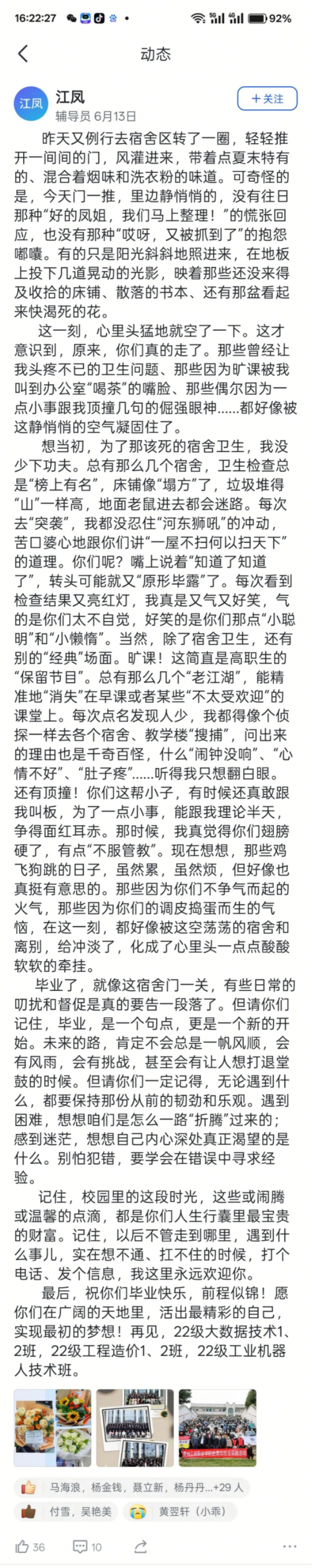 辅导员陈玲老师走进空荡的宿舍楼,仿佛还在昨日的喧嚣中,字里行间满是对22级计算机专业1、2、3、4班孩子们的回忆与“如果可以……”的无限怅惘。她珍藏的三下乡实践等照片、学生实习归来领取毕业证时的五味杂陈……,是无数工贸师生三年朝夕相处、亦师亦友情谊的生动缩影。