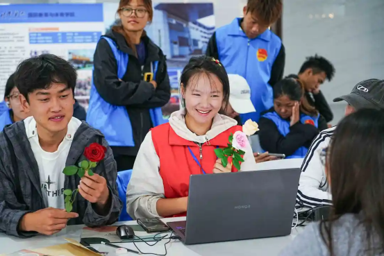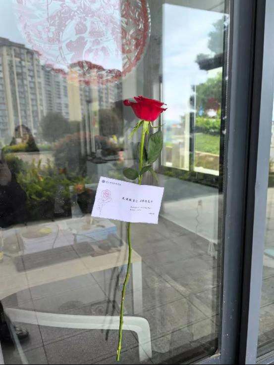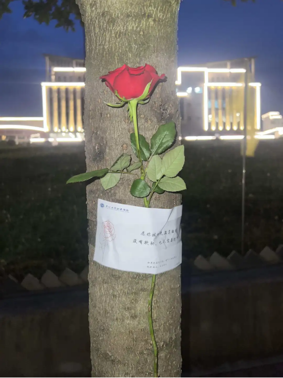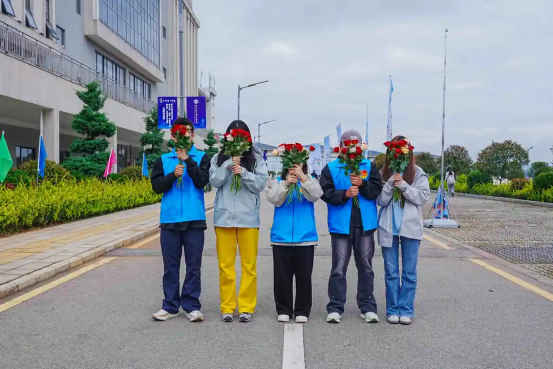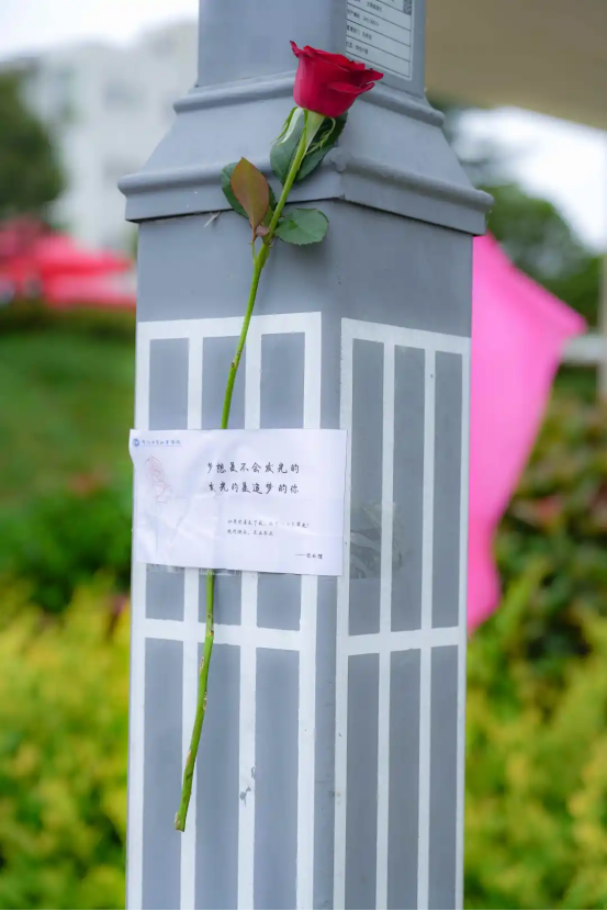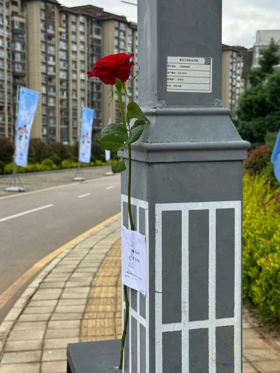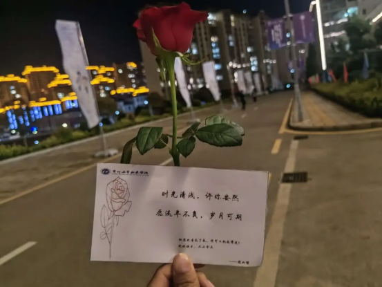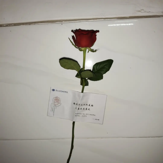 活动当天,图书馆精心布置校园环境,在校园内张贴玫瑰花与青春励志的标语,传递奋斗与希望的力量。同时,志愿者们将一枝枝象征美好与祝福的玫瑰花送到新生手中,花香与笑颜交织,让新同学在初入校园的第一时间就感受到来自学校的关怀与温暖。