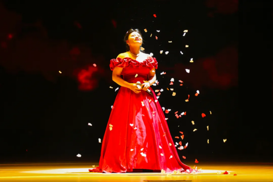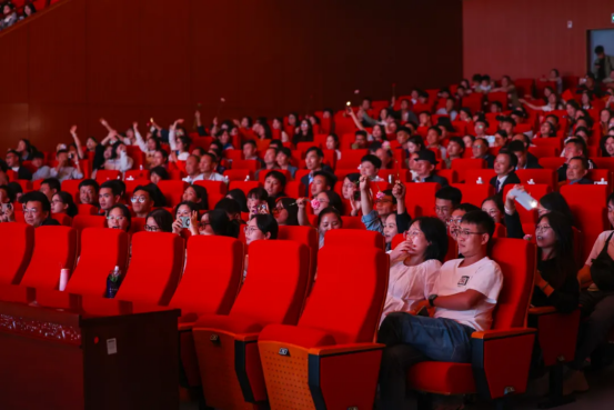 落幕之后,许多老师依然留在剧场中合影、交谈。他们眼角有光,手中有花,而身后,是一片被点亮的海。