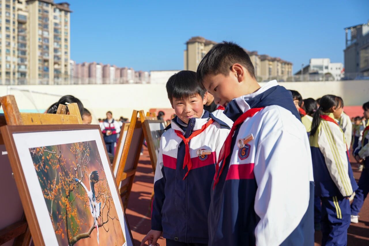 来自威宁四小、威宁六小的小朋友们围在摄影作品前,论着鸟类的外形、生活习性,培养敏锐的观察力与探索精神。这种对自然的亲近与热爱,将伴随他们一生,让他们懂得尊重生命、保护环境。