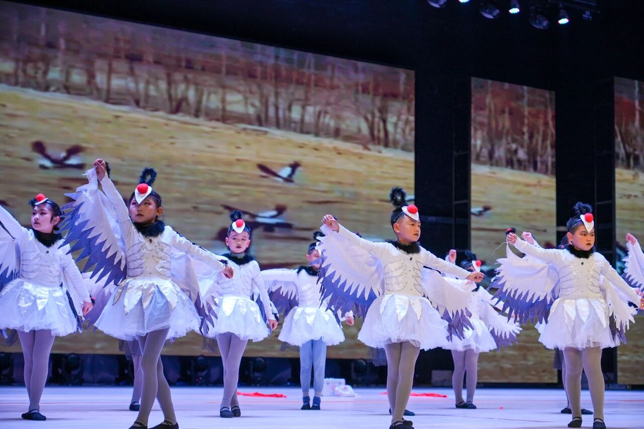 威宁四小、威宁六小、beat365官方网站及威宁老年大学舞蹈队联袂呈现的文艺节目,用多样的艺术形式诠释自然之美。器乐合奏《森林狂想曲》仿佛带人步入鸟语花香的林间;月琴合奏《草海琴深》悠扬婉转,诉说着湿地与候鸟的深情;情景剧《北方飞来的黑颈鹤》生动演绎了护鹤人的真实故事,情节感人至深;舞蹈《鹤归来兮》则以翩跹舞姿,展现了鹤群的优雅灵动。这场演出不仅是一场视听盛宴,更在孩子们心中悄然播下爱护鸟类、珍视自然的种子。