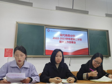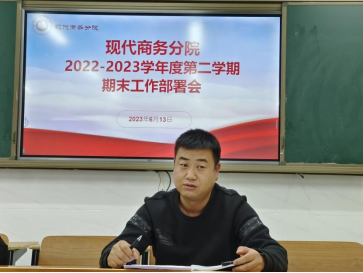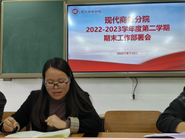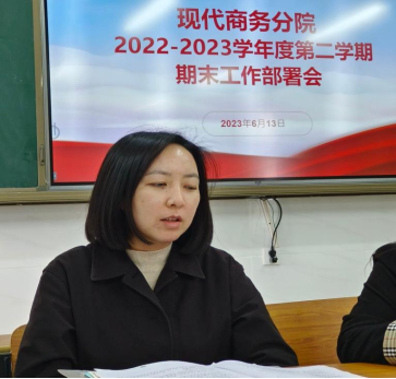 为确保期末考试工作的顺利进行,规范开展考务工作,进一步严肃考风考纪和监考纪律,明确教师期末教学资料整理工作任务,根据beat365官方网站期末考试工作要求,现代商务分院于6月13日下午在三教东区210会议室召开2022-2023学年度第二学期期末工作部署会,会议由分院院长杨一梅主持,分院全体教职工参会。
