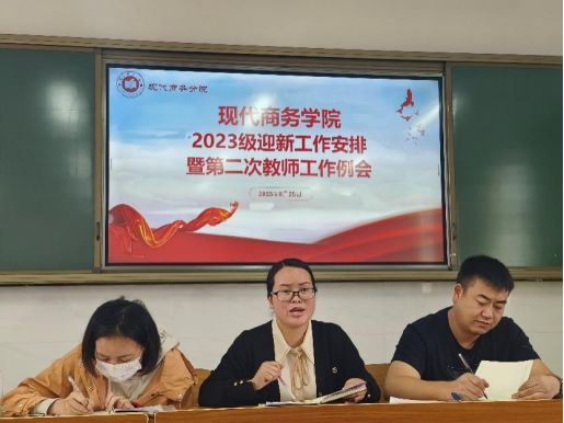 为认真做好2023级新生入学报到和接待工作,8月25日,现代商务学院召开2023级新生入学工作部署会议。院长杨一梅、各部门负责人、辅导员及科任老师参加了本次会议。