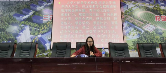 本次思政教育课讲座马勋梅老师主要从十个篇幅展开讲解。一是新生欢迎篇,她告知同学们在大学里一定要学会感恩,感恩父母,感恩他人,感恩学校,感恩社会;二是红色基因前言篇;三是习总书记篇,每一代人有每一代人的长征路,每一代人都要走好自己的长征路;四是红色文化篇;她通过红军长征和辽沈战役告诫同学们温室大棚养不出参天大树,风雪磨砺方能成就松柏挺立,青年大学生在思想上要有"吃苦"准备,传承红色精神,认识到幸福生活是拼出来、干出来的。五是毕节草海篇;六是毕节乡村产业振兴篇;七是新生军训篇;大学生应活在当下,与时俱进,努力做好眼前的一切。八是党送温暖篇,“两免一补”、大学生生源地助学贷款,精准扶贫补助等优惠政策的讲解;九是坚定信念篇,大学一定要从多方面坚定信念跟党走;十是新时代大学生篇,“活到老学到老”,在学习中得到自我、提升自我,争做有理想、敢担当、能吃苦、肯奋斗的新时代大学生,传承红色精神,做时代新人。