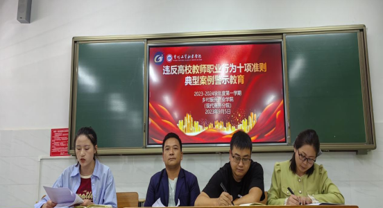 年9月5日下午,乡村振兴产业学院(现代商务学院)在三教南区307召开违反高校教师职业行为十项职业准则典型案例警示教育暨毕节市师德师风负面清单对照学习专题会议,动员全院教师树师德、立师表、铸师魂、强师能、正师风,提高自身素质,以饱满的工作热情和一流的工作业绩,推动学院又好又快发展。会议由办公室主任袁优主持。