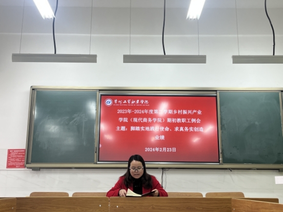 2024年2月23日上午,乡村振兴产业学院(现代商务学院)全体教职工在会议室召开2023年-2024年度第二学期开学工作专题会,本次会议主题为:脚踏实地践行使命,求真务实创造业绩。由常务副院长杨一梅主持。