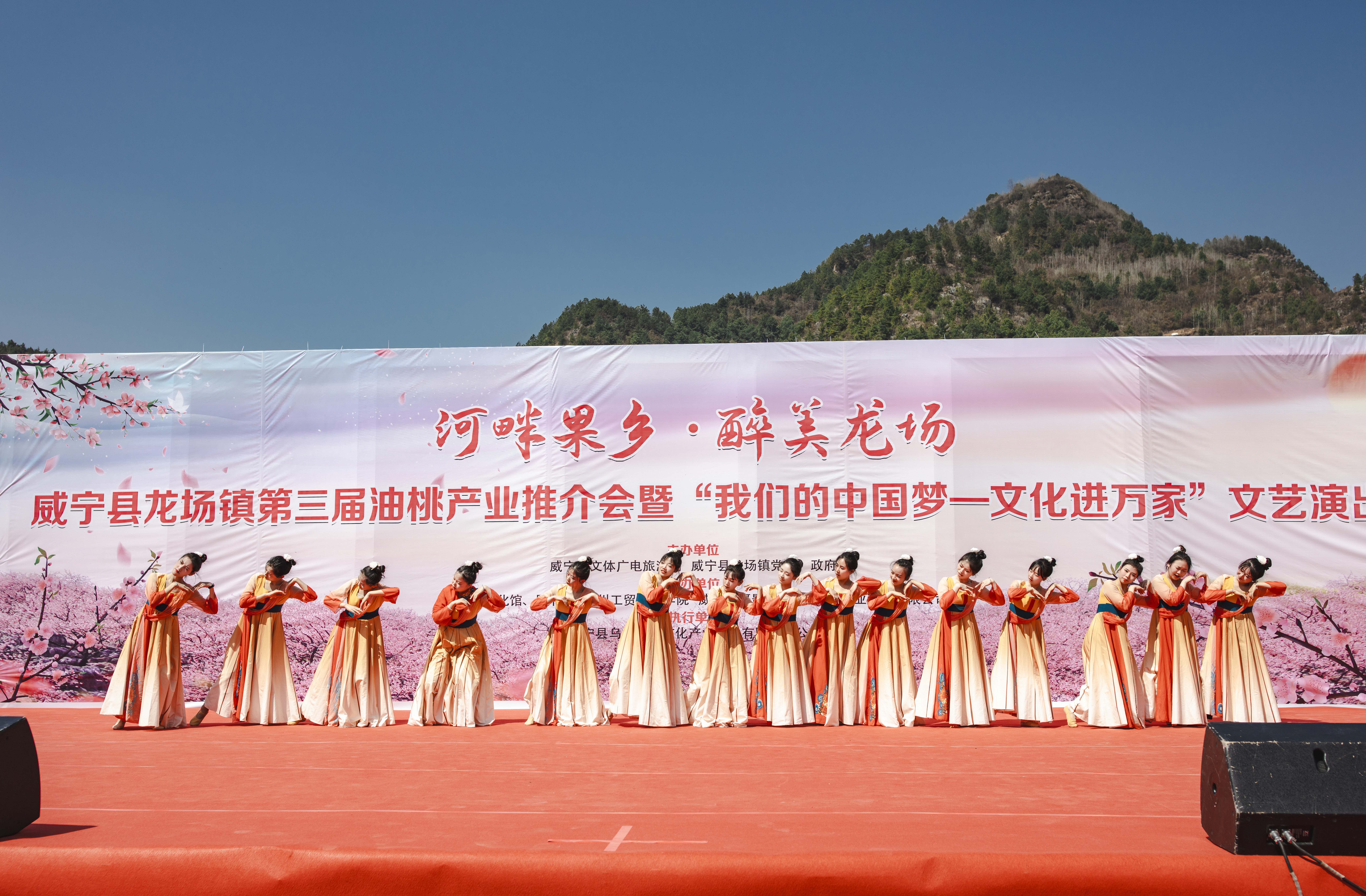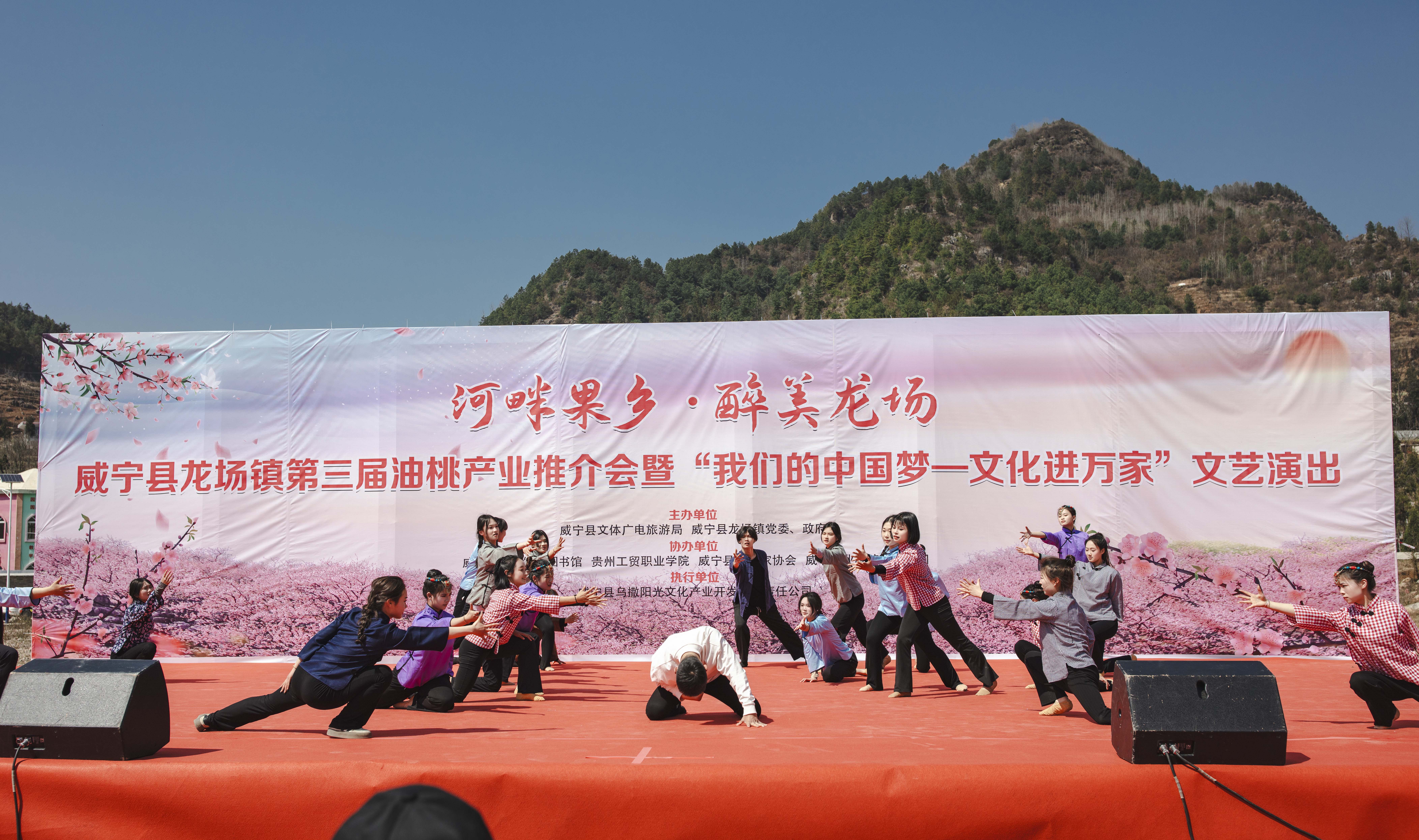 3 月 15 日,第三届油桃产业推进会暨“我们的中国梦——文化进万家”文艺演出在威宁县龙场镇举行,此次活动由威宁县文体广电旅游局、威宁县龙场镇党委、政府主办,beat365官方网站作为协办单位。此次推介会不仅是威宁县油桃产业发展的重要里程碑,也是我校今年校企合作、服务地方的首个重要举措。活动现场,beat365官方网站艺术学院的学生们身着盛装,为广大群众打造一场精彩的视听盛宴。艺术学院带来了舞蹈《唐印》以其古朴典雅的风格,将观众带入了盛唐的繁华盛景;而《玛曲姑娘》则以其欢快的节奏和活泼的舞姿,展现了藏族少女的青春活力;《希望》则以深情的演绎,传递出对未来的美好憧憬;最后,舞蹈《堆谐》更是将现场气氛推向高潮,学生们用精湛的技艺和饱满的情绪,赢得了观众的阵阵掌声。