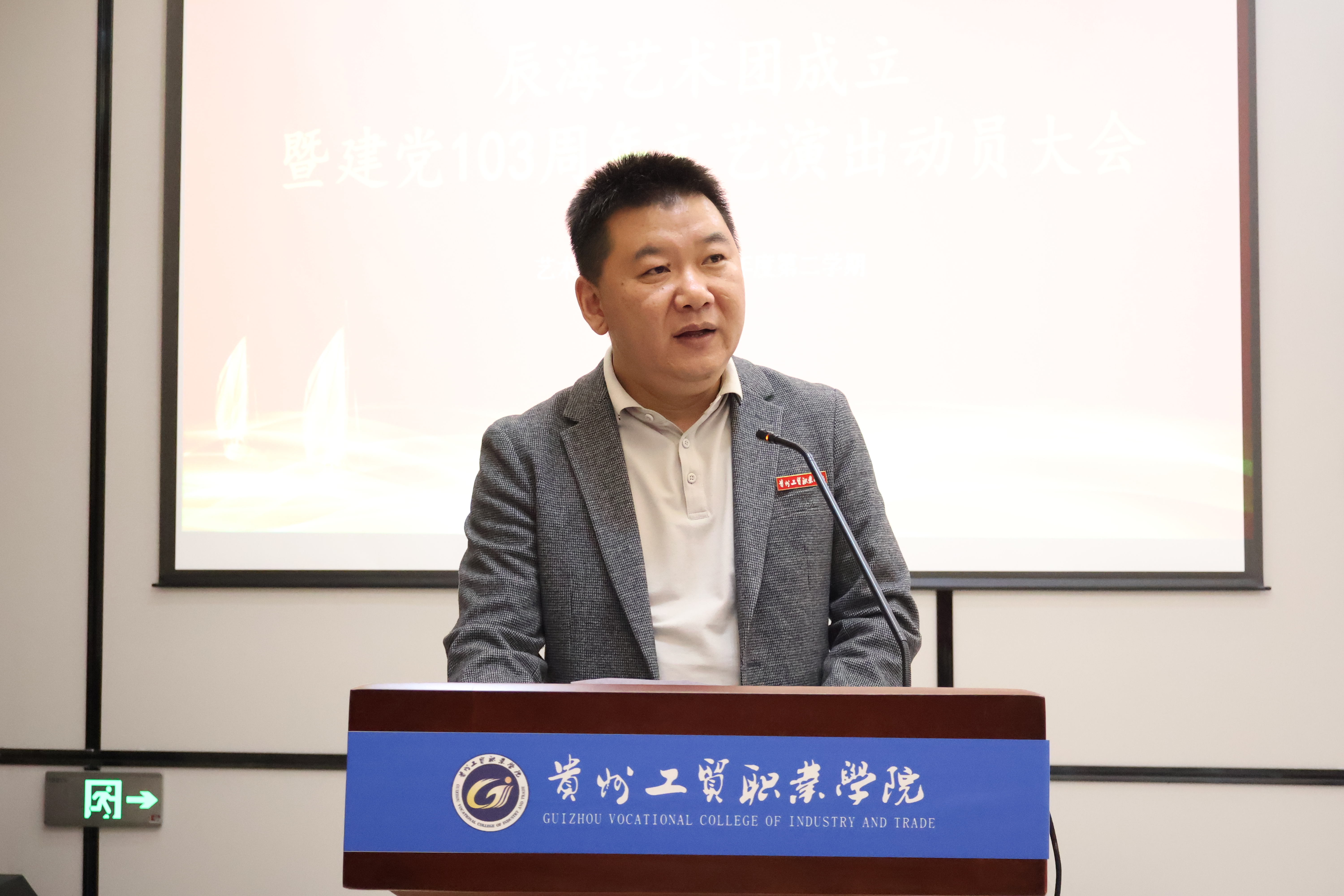 5月30日下午,艺术学院组织召开“辰海艺术团成立暨建党103周年文艺演出动员大会”,,校党委副书记、纪委书记聂立新,校党委委员、副校长宋新乐,艺术学院院长周正军,艺术团全体成员参加会议。大会由周正军主持