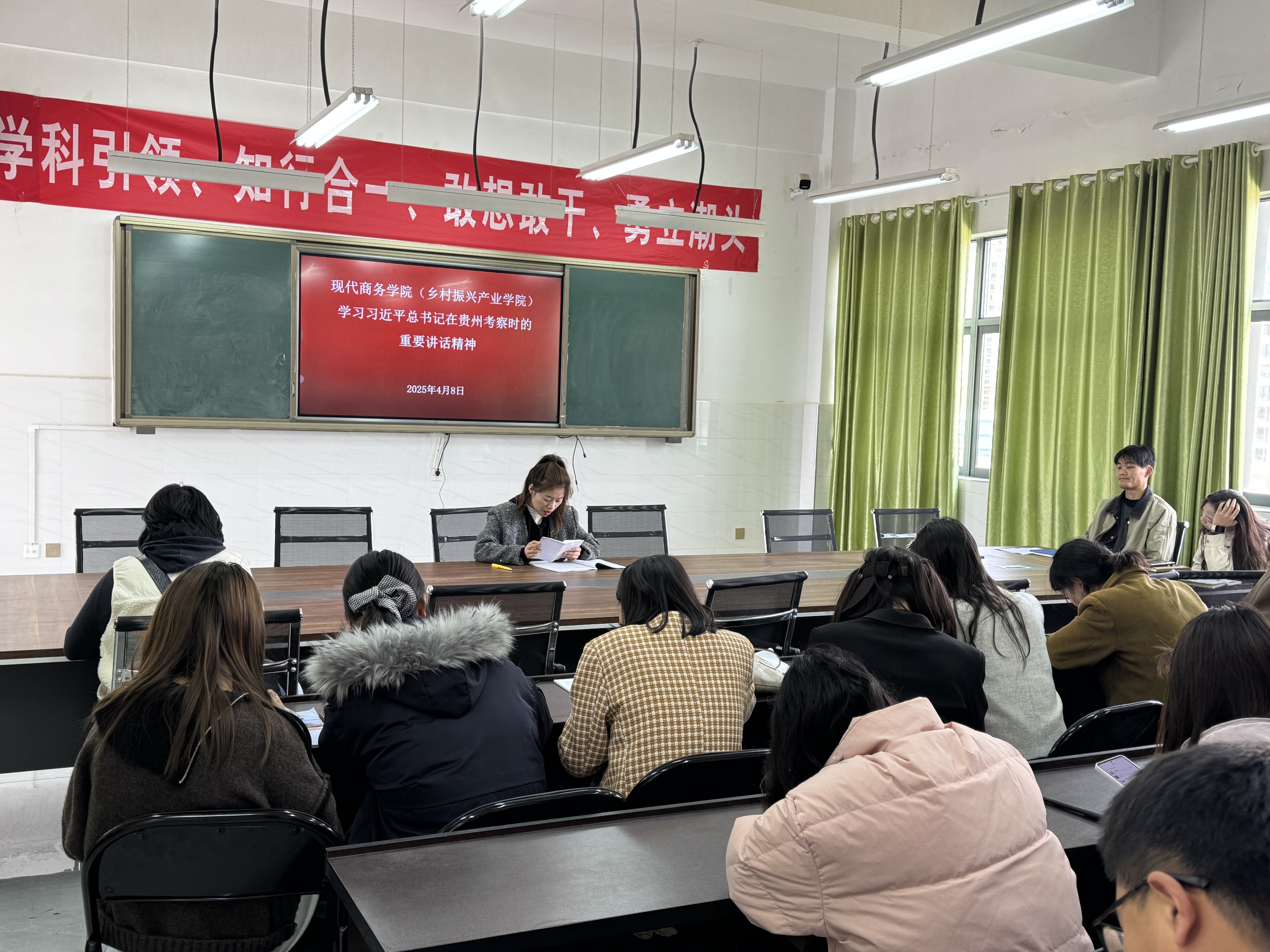 为深入学习贯彻习近平总书记2025年3月17日至18日在贵州考察时的重要讲话精神,现代商务学院(乡村振兴产业学院)4月8日组织全体教职工召开专题学习会议,结合学院职能与乡村振兴实践,切实将讲话精神转化为推动学院高质量发展、服务乡村振兴战略的行动指南。本次会议由现代商务学院党支部组织委员崔香伶主持。