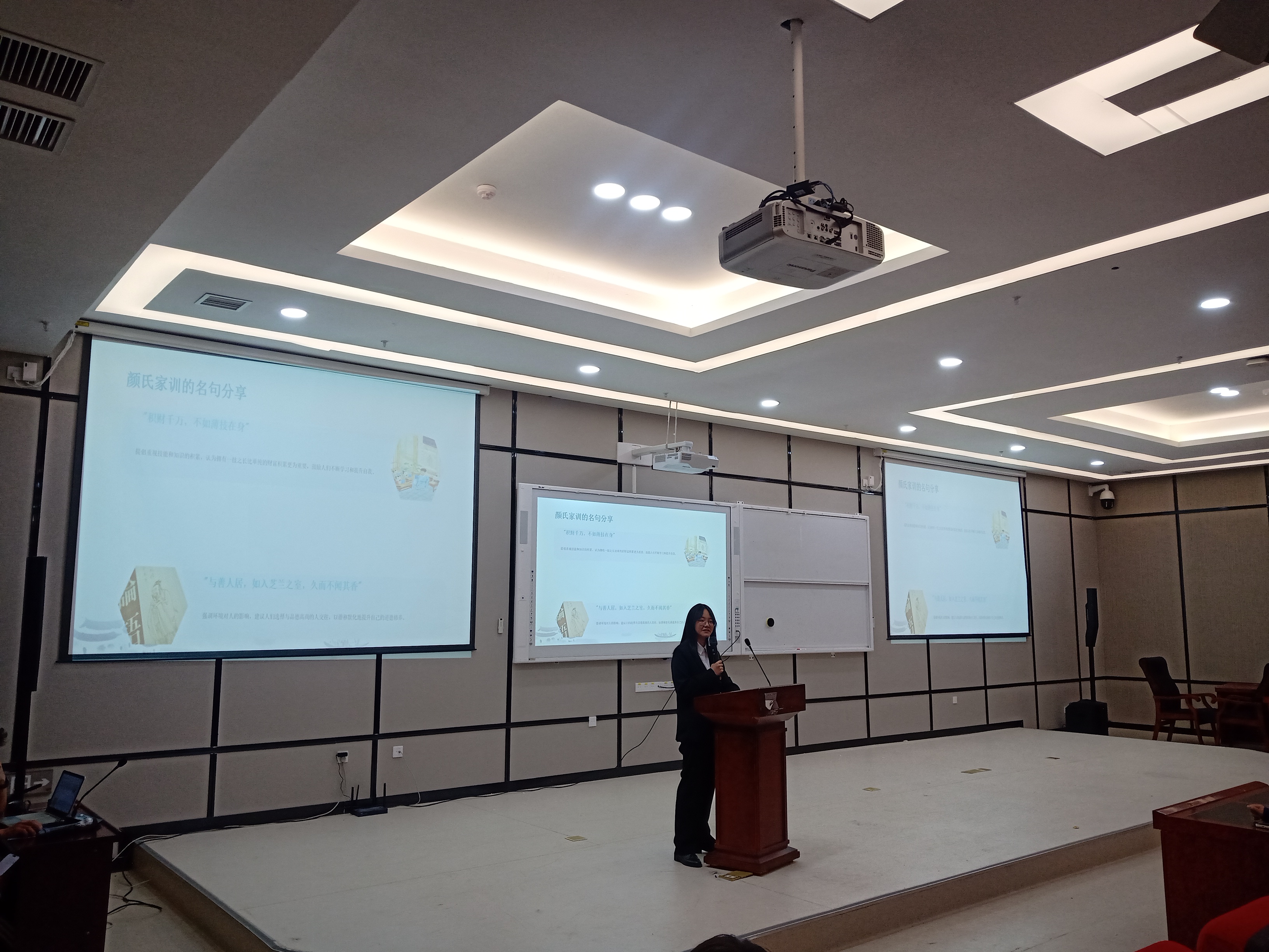 阅读是一场心灵的洗礼,能予人欢乐、增人光彩、启迪智慧。在这场思想碰撞的活动中,师生们怀揣热忱,积极分享,以书会友,其乐融融。现场书香弥漫,分享者畅谈感悟,共同享受了一场精神盛宴。24级吴晓颖同学分享了《颜氏家训》,介绍了作者颜之推的生平及著书背景。作为中国古代家训的开山之作,该书对后世家庭教育影响深远。通过"积财千万,不如薄技在身"和"与善人居,如入芝兰之室,久而不闻其香"等名言,她鼓励大家勤学修身。聚焦"自古明王圣帝,犹须勤学,况凡庶乎"的核心命题,强调无论身份高低,学习都是立身之本。