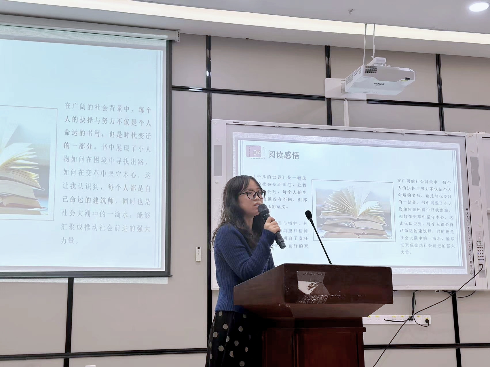 刘佳老师分享了阅读《平凡的世界》的感悟。她认为这部作品是一幅生动的社会变迁画卷,每个人的生命轨迹虽各不相同,却都有着不凡的意义。书中人物的抉择与努力既是个人命运的书写,也是时代变迁的缩影。她感慨道:"每个人都是自己命运的建筑师,同时也是社会大潮中的一滴水,正是这些水滴汇聚成推动社会前进的强大力量。"