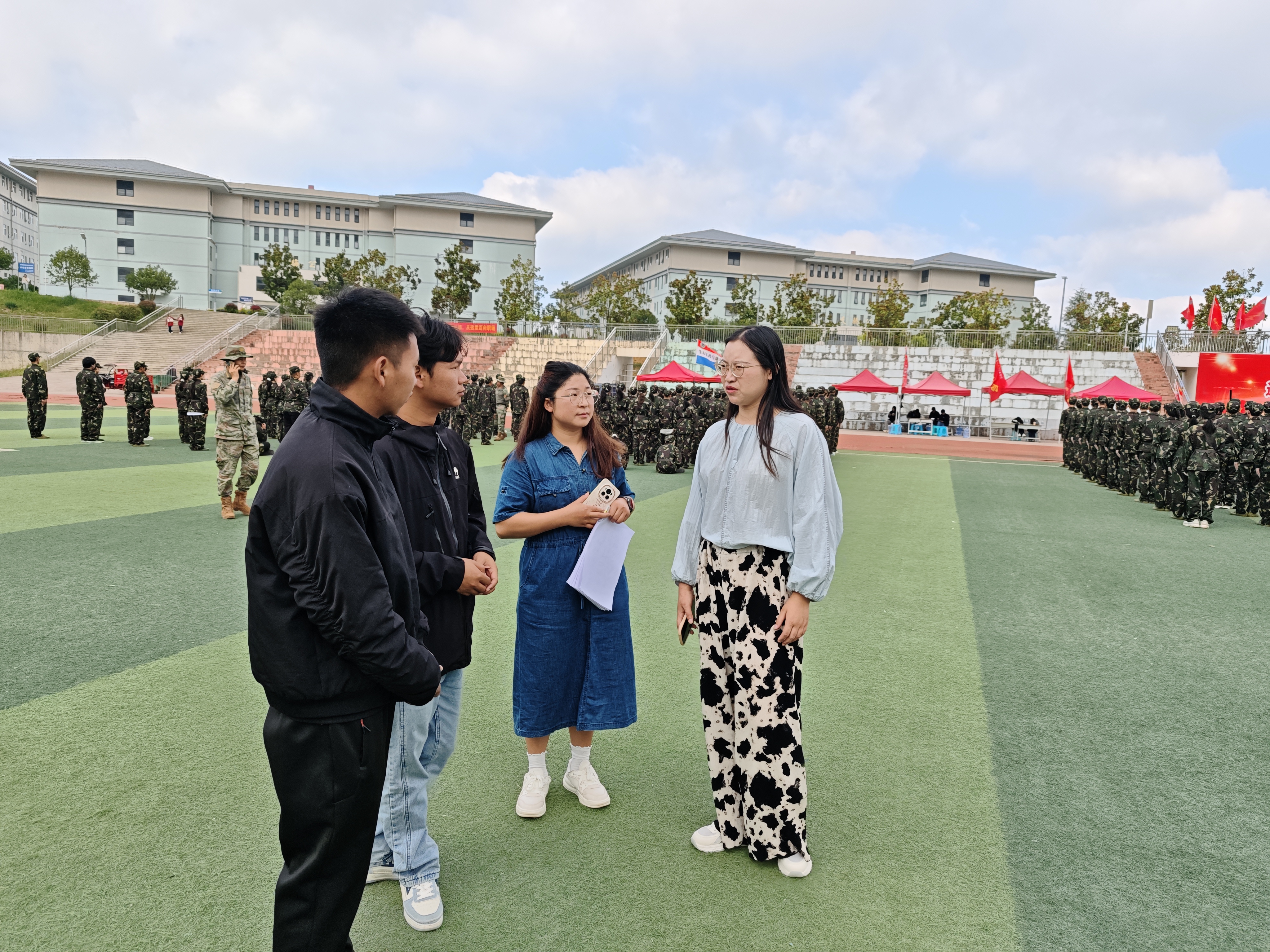志愿者们分工明确,各司其职。时刻关注新生们的身体状况,及时为出现不适的同学提供帮助;穿梭于各训练方阵之间,协助教官传递指令、维持秩序;同时主动与新生交流谈心,分享大学生活经验,帮助他们更快地适应新的环境和集体生活,有效缓解初次离家的焦虑和军训的紧张情绪。