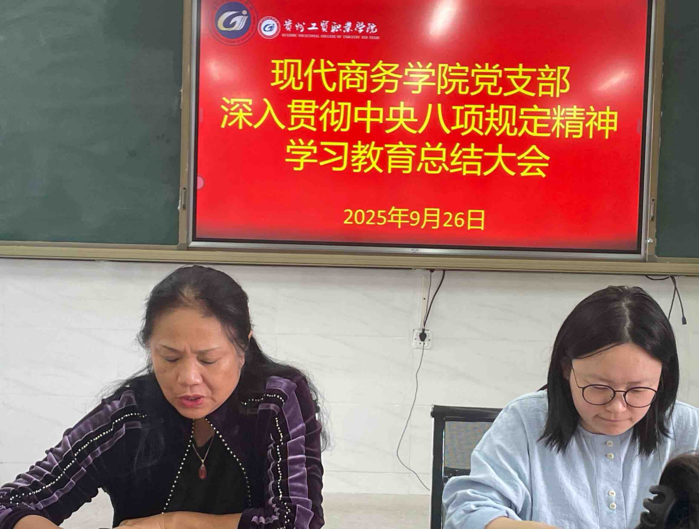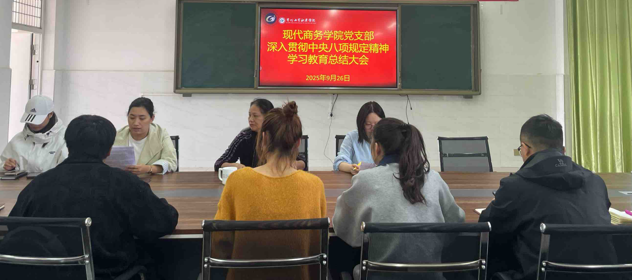 为巩固深化中央八项规定精神学习教育成果,推进作风建设常态化长效化,9月26日,现代商务学院党支部召开深入贯彻中央八项规定精神学习教育总结大会,系统梳理工作、明确后续方向,会议由现代商务学院党支部书记黄教珍同志主持,全体党员参会。
