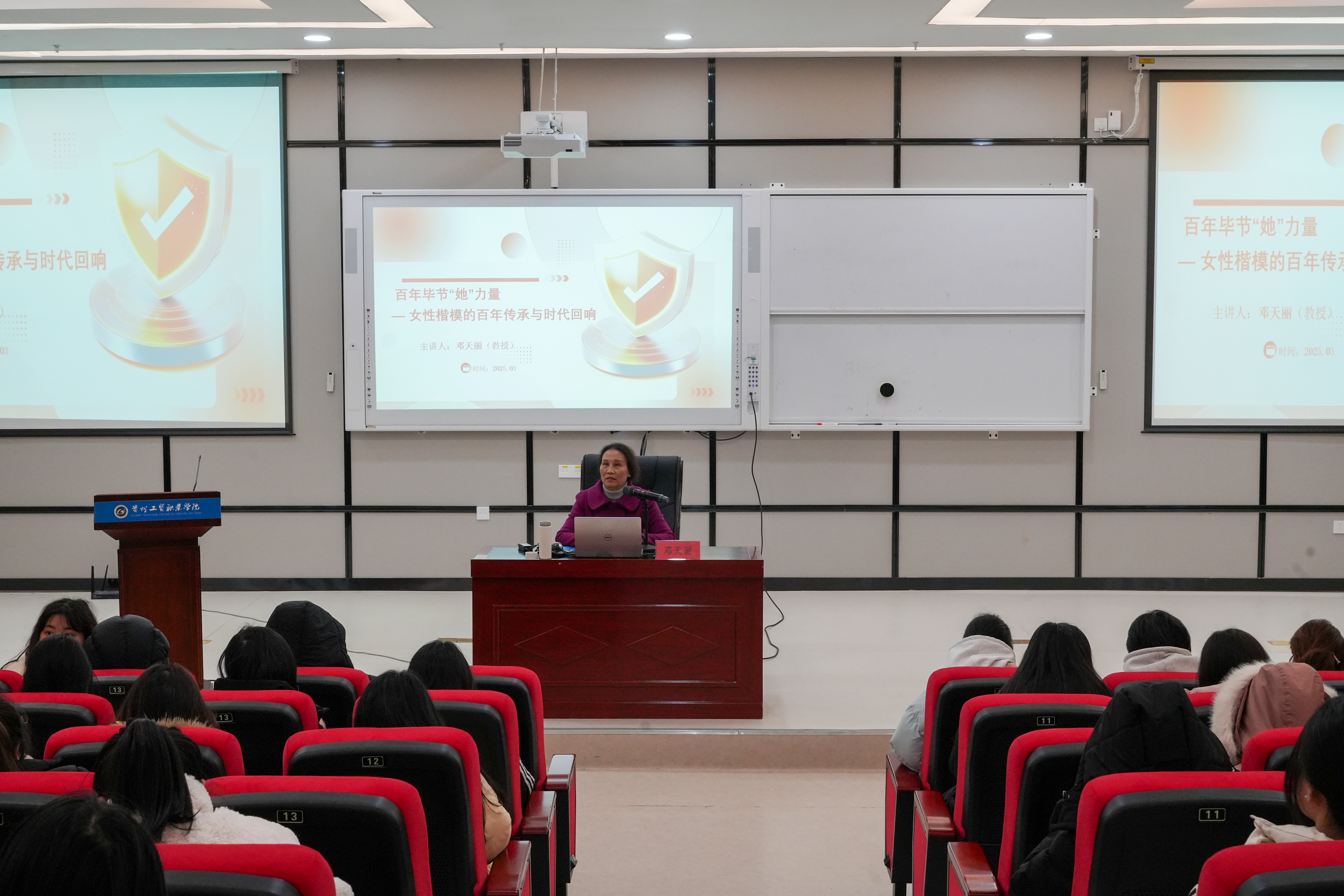 邓天丽教授围绕着“三八”国际劳动妇女节的由来,讲述了“三八”国际劳动妇女节是为庆祝妇女在经济、政治和社会等领域作出的重要贡献和取得的巨大成就,向女性表达敬意和尊重而设立的节日。随后,邓天丽教授聚焦于贵州毕节一百多年来杰出女性代表人物,讲述了元明之际的奢香夫人策马穿越乌蒙山,其开设龙场九驿的壮举不仅打通西南丝路,更以“兴教化、促交融”的智慧诠释跨越时空的治理艺术;烽火岁月中的熊蕴竹手执《新华日报》,这位潜伏敌后15载的地下党员,用浸透密写药水的婚戒传递革命火种,在贵州党史上书写“永不消逝的电波”;改革开放浪潮里的蔡群手持蜡刀,将千年苗族蜡染技艺转化为富民产业,带领2000余名绣娘以针为笔、以布为纸,绘就非遗活态传承的当代图景;新时代赛道上,夏雨雨在杭州亚运会女子万米决赛最后400米逆袭夺冠的影像燃动全场,这个从威宁草海畔跑向世界冠军的姑娘,让“贵州加速度”闪耀国际舞台。这种精神激励着一代又一代的毕节女性,在各自的领域中发光发热,为家乡的发展贡献自己的力量。