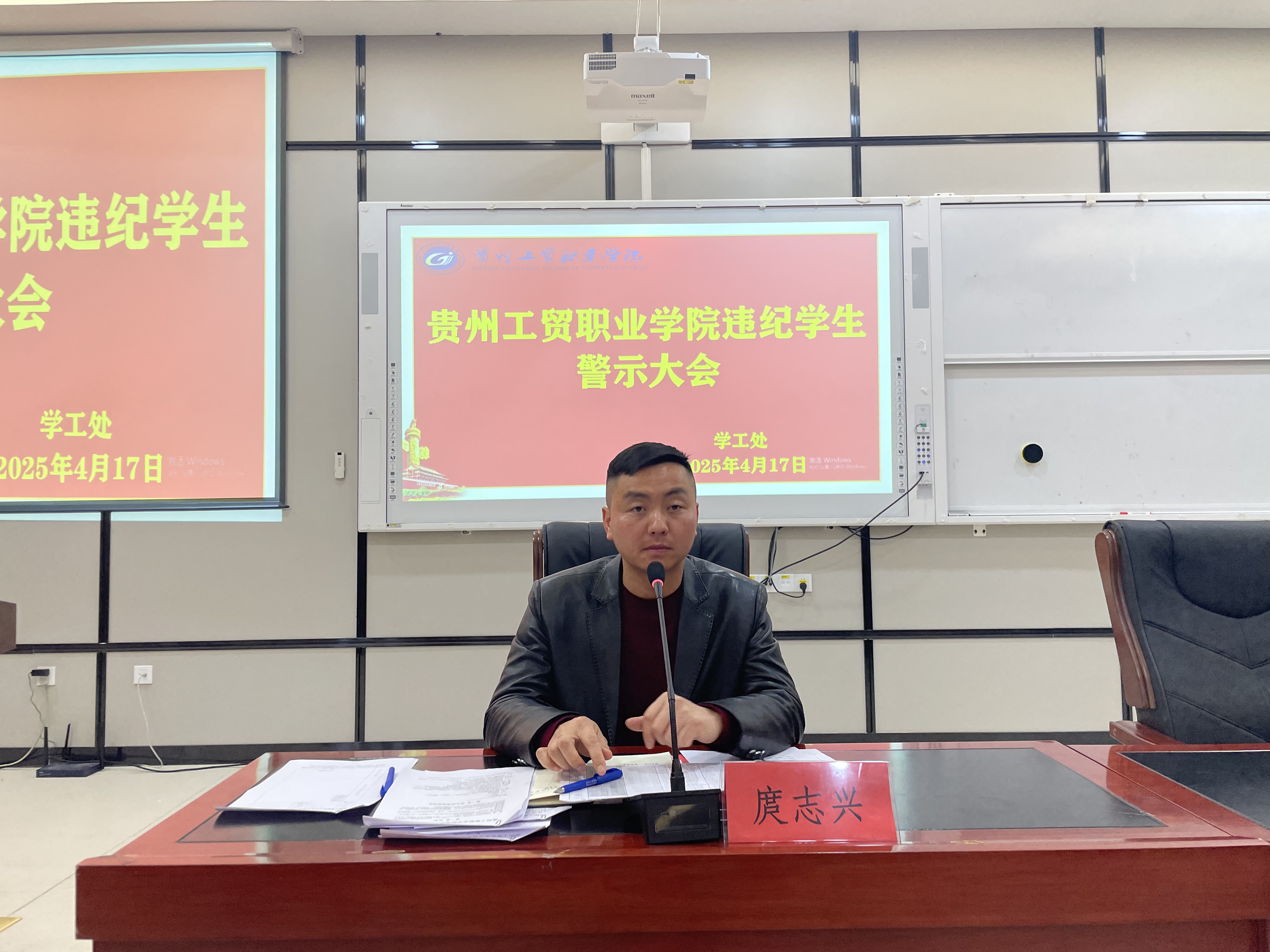 江燕虎通报本学年开学以来学生违纪情况,结合具体案例进行成因分析,以数据与事实为基础,为全体参会人员呈现校园纪律管理现状,敲响遵规守纪的思想警钟。