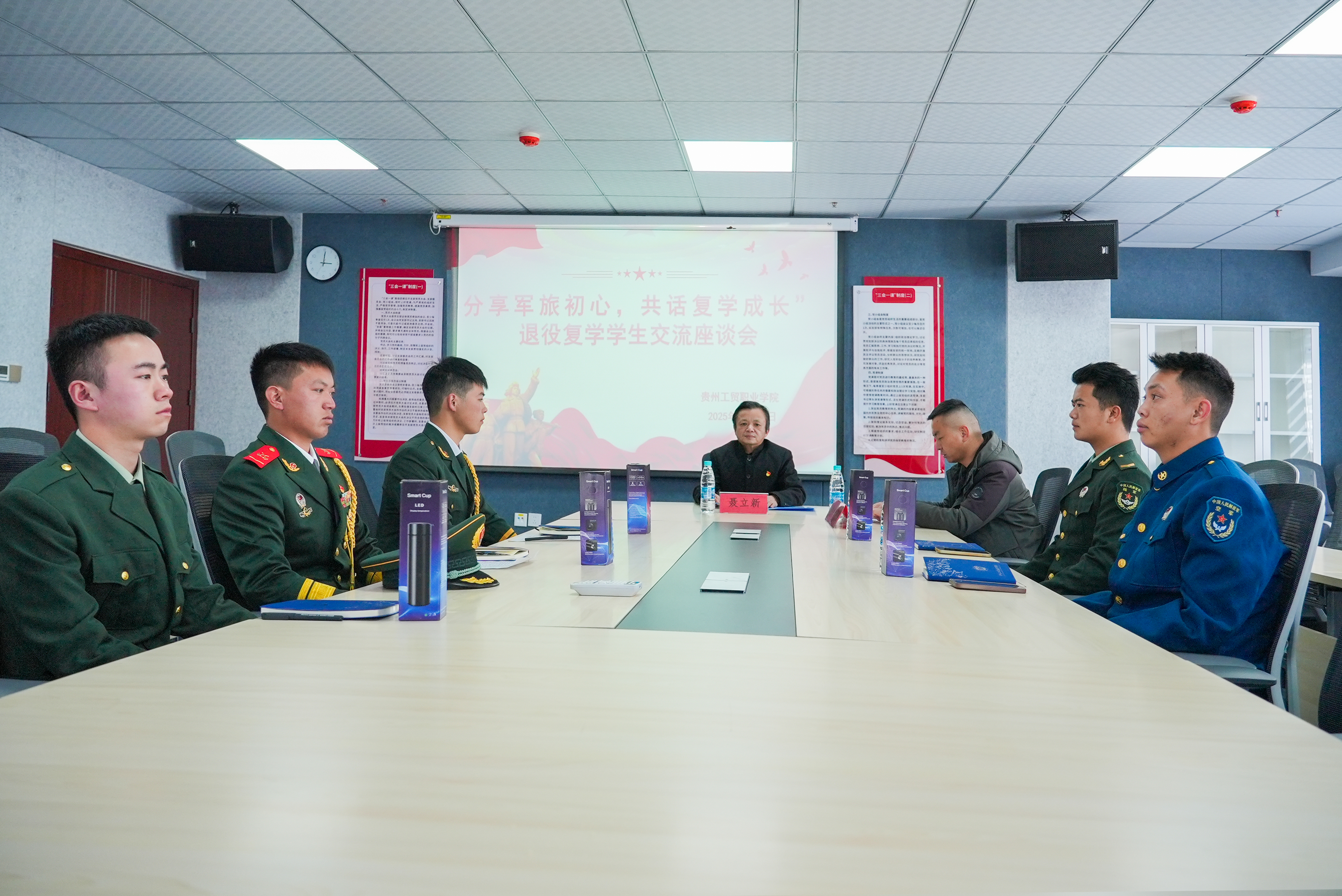 为搭建学校与退役复学学生的深度沟通桥梁,精准破解学生复学后在学业、生活、心理等方面的困惑,助力其快速融入校园生活,11月27日,“分享军旅初心,共话复学成长” 退役复学学生交流座谈会在图书馆 417 会议室顺利举办。校党委副书记、纪委书记聂立新,学工处处长庹志兴等领导,以及部分退役复学学生出席本次座谈会。