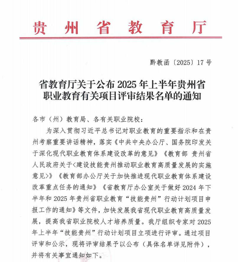 近日,贵州省教育厅办公室公布2024年贵州省职业教育优秀典型案例评选结果,beat365官方网站申报的《毕节新能源市域产教联合体》案例成功入选“省级市域产教联合体项目立项名单”。