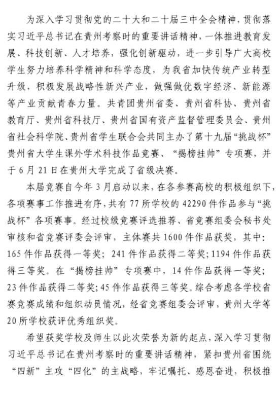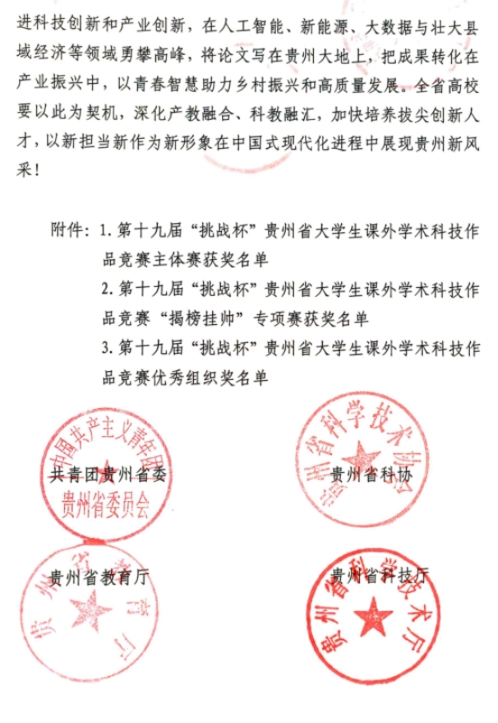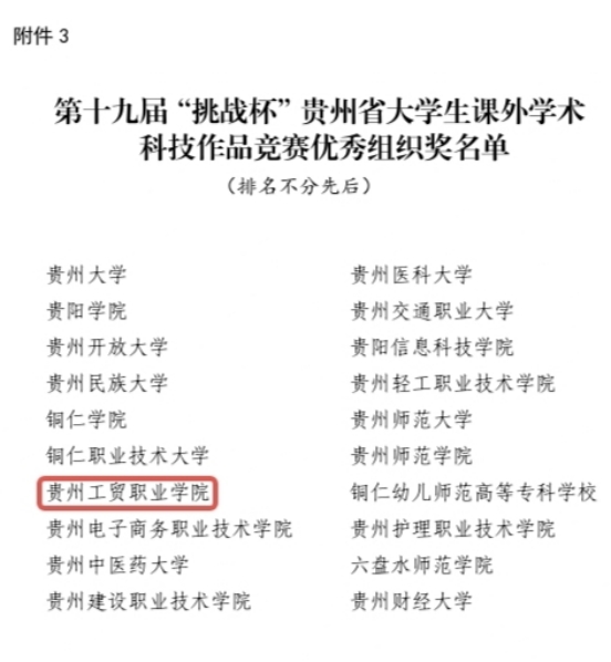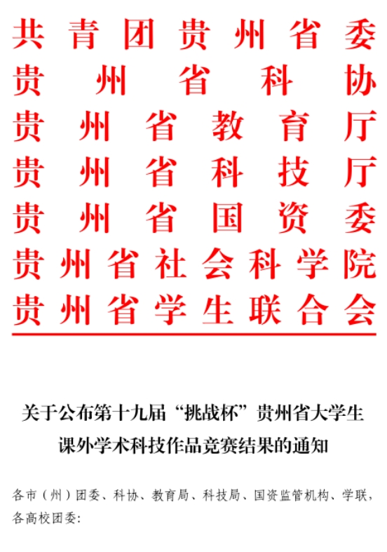 金秋传喜报,创新绽光彩!在第十九届“挑战杯”贵州省大学生课外学术科技作品竞赛中,在上级团组织的指导关心下,在全校师生的共同努力下,我校不负众望的荣获“优秀组织单位”奖。