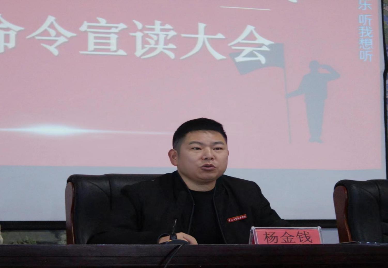 杨金钱在讲话中指出设立预征学员大队的意义是为了探索出一条教育工作和军事工作相结合的新路径,打造出一个稳定的高素质兵源储备库,也是为了培养出一批从事国防建设和地方经济发展建设的高素质人才。他还提出对全体学员的要求:要保持积极的学习态度,认真听讲、不断提高自己的学术水平和综合素质,强化文化自信,增强爱国爱校意识,树立对祖国、对人民的深厚感情,秉承"爱国、爱党、爱校"的精神,勇做祖国的栋梁之材。