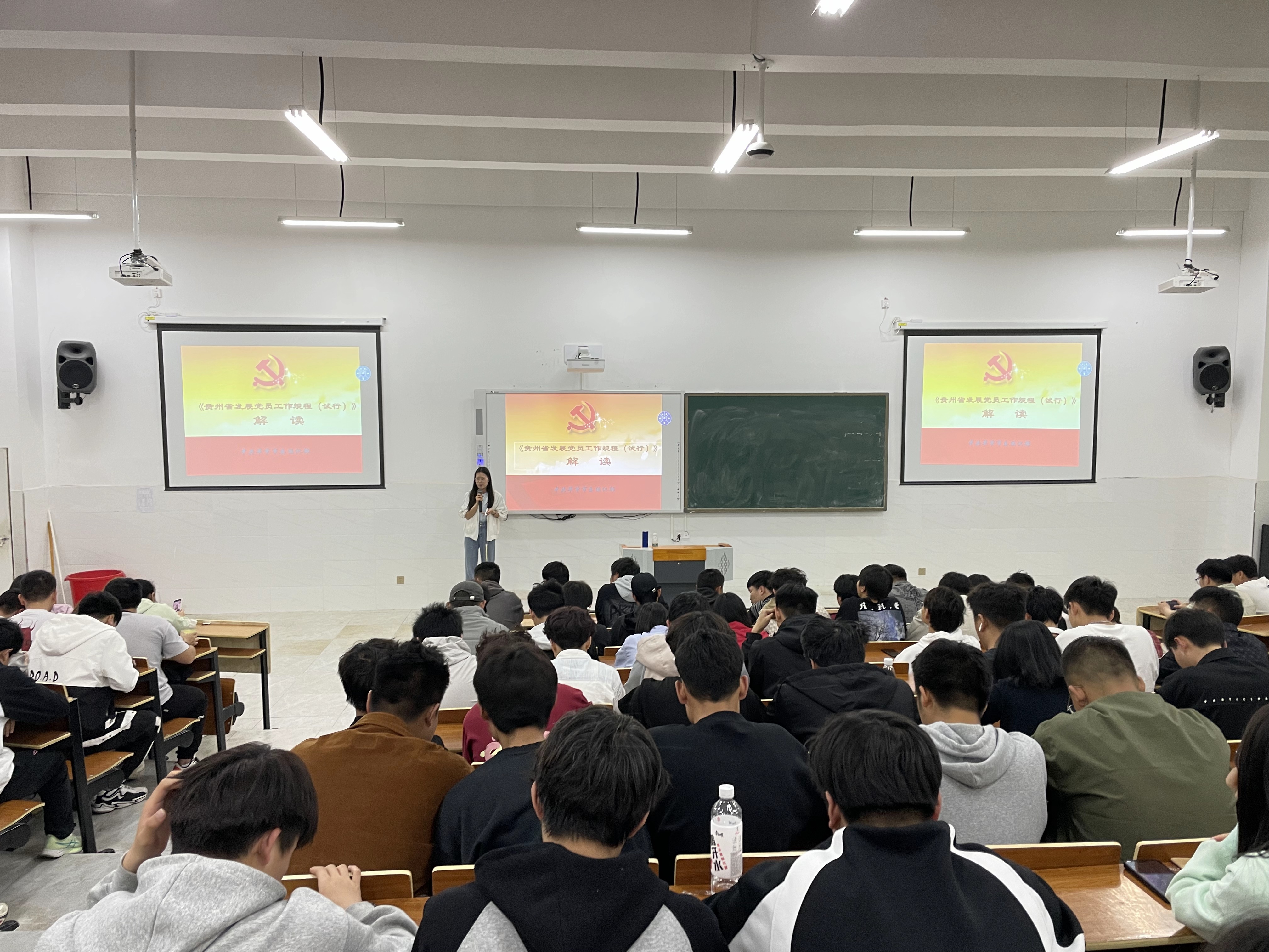 为了深入贯彻落实党的二十大精神,加强党员队伍建设,提高党员发展工作的规范化、科学化水平,4月16日晚,新能源产业学院(智造工程学院)组织各班入党积极分子以及团员在一号教学楼第四阶梯教室,开展以“《贵州省发展党员工作规程(试行)》解读”为主题的讲座。本次讲座由智造工程学院党支部宣传委员方谦主讲。