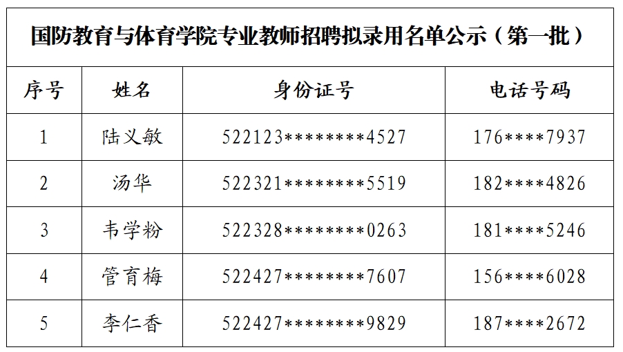 根据《beat365官方网站国防教育与体育学院专业教师招聘公告》要求,经简历初筛、面试(试讲)、综合评价,学校研究决定,拟聘用以下同志到我校工作,现予以公示: