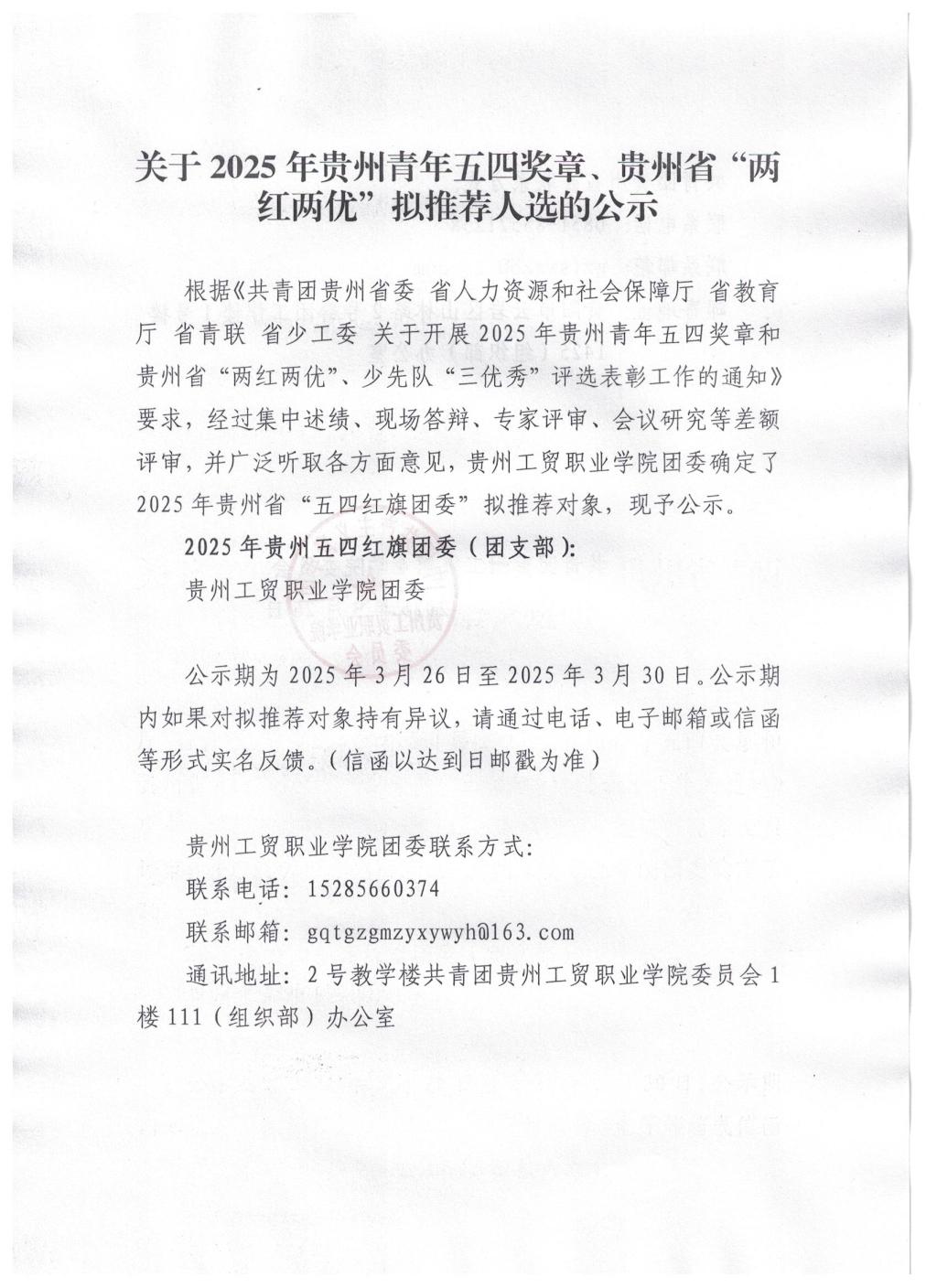 关于2025年贵州青年五四奖章、贵州省“两红两优”拟推荐人选的公示