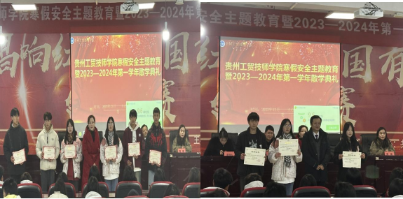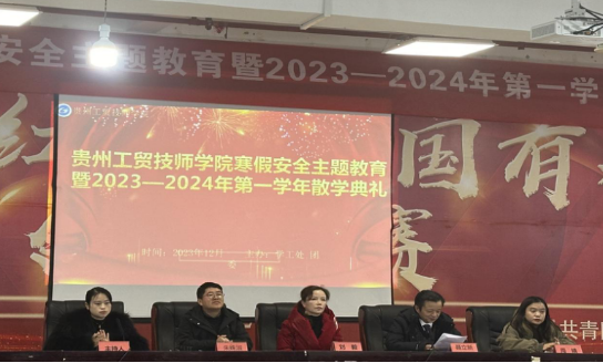 伴随着冬季的脚步,承载着辛勤耕耘的喜悦,在全体师生的共同努力下,贵州工贸技师学院紧张忙碌的2023—2024学年第一学期即将结束。为了给本学期的学习之旅划上一个完美的句号,12月22日上午,在综合楼二楼草海大讲堂举行了“寒假安全主题教育暨2023—2024学年第一学期散学典礼”,典礼在雄壮的国歌声中拉开帷幕,仪式庄严肃穆。beat365官方网站党委副书记聂立新、贵州工贸技师学院执行院长刘毅、学工处副处长朱姝淑、教务处副处长周婧、行政人员及全体班主任、学生参加了散学典礼。