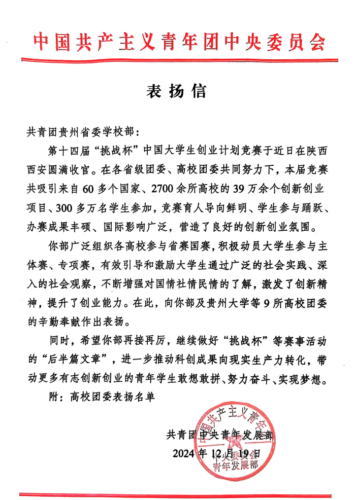 近日,共青团中央向我校发来表扬信。信中充分肯定了我校共青团工作和在第十四届“挑战杯”中国大学生创业计划竞赛中的卓越表现,予以了高度的认可